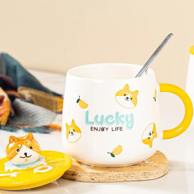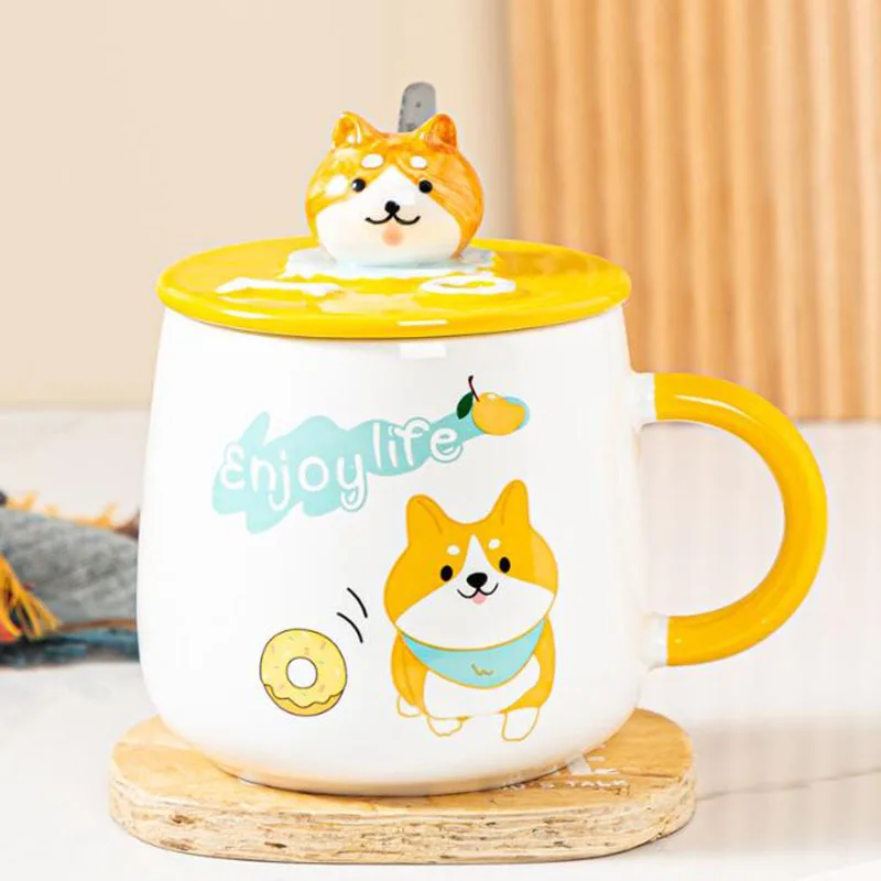 Cartoon Ceramic Dog Head Lid Coffee Mug Breakfast Milk Mug Office Water Cup with A Spoon Kitchen Drinkware