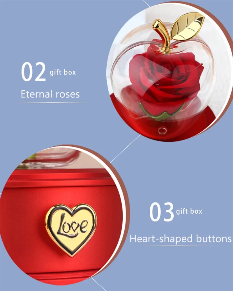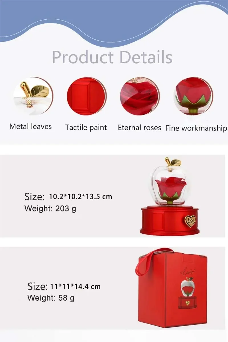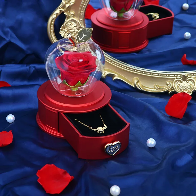 Eternal Rose Apple Shaped Ornament with Red Drawer Base for Necklace and Ring with Exquisite Gift Box Handbag