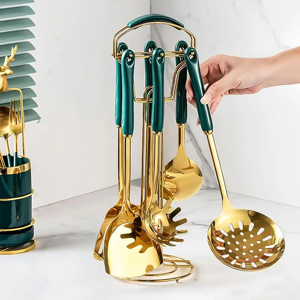 Stainless Steel Kitchen Utensils Set with Holder, Kitchen Accessories for Cooking Includes Soup Ladle, Metal Spatula